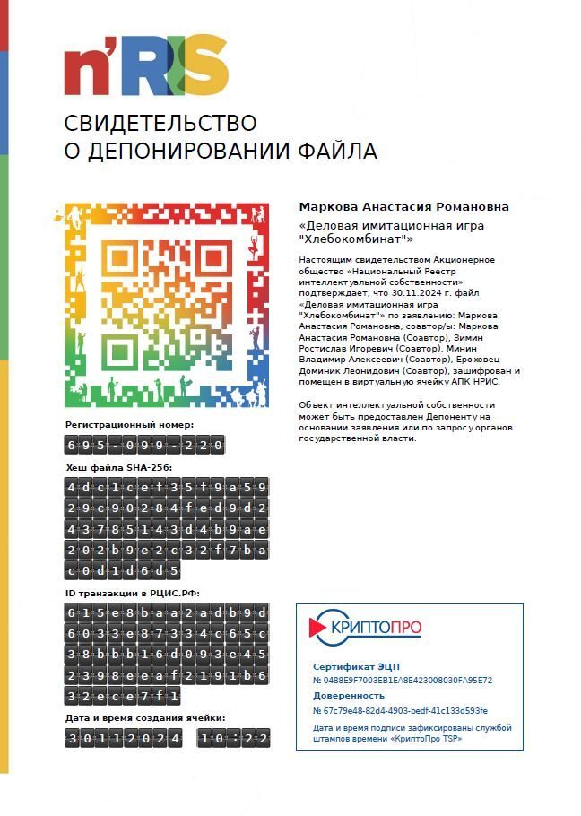 Так, РЦИС зарегистрировал деловые имитационные игры «Хлебокомбинат» (авторы: Анастасия Маркова, Ростислав Зимин, Владимир Минин, Доминик Ероховец), «Конфетная фабрика» (авторы: Мария Любович, Кирилл Ямзин, Айназ Мавлембердин, Андрей Уткин) и интерактивную образовательную деловую игру «Империя решений» (авторы: Ксения Измоденова, Екатерина Хайдукова, Диана Обеланова, Айзанат Ибракова, Анастасия Маркова).