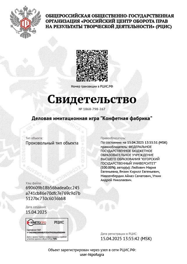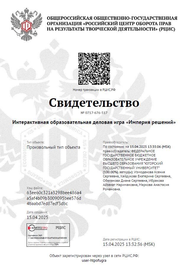 Югорский госуниверситет успешно зарегистрировал в Российском центре оборота прав (РЦИС) три уникальные деловые игры, которые разработали сотрудники и студенты ЮГУ. Это важный шаг в развитии образовательных технологий университета. Ведь полученные свидетельства подтверждают авторские права ЮГУ и дают юридическую защиту, гарантирующую уникальность и качество методик.