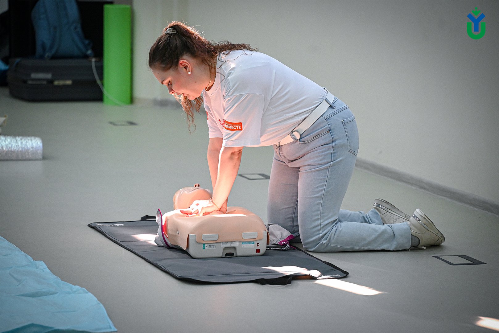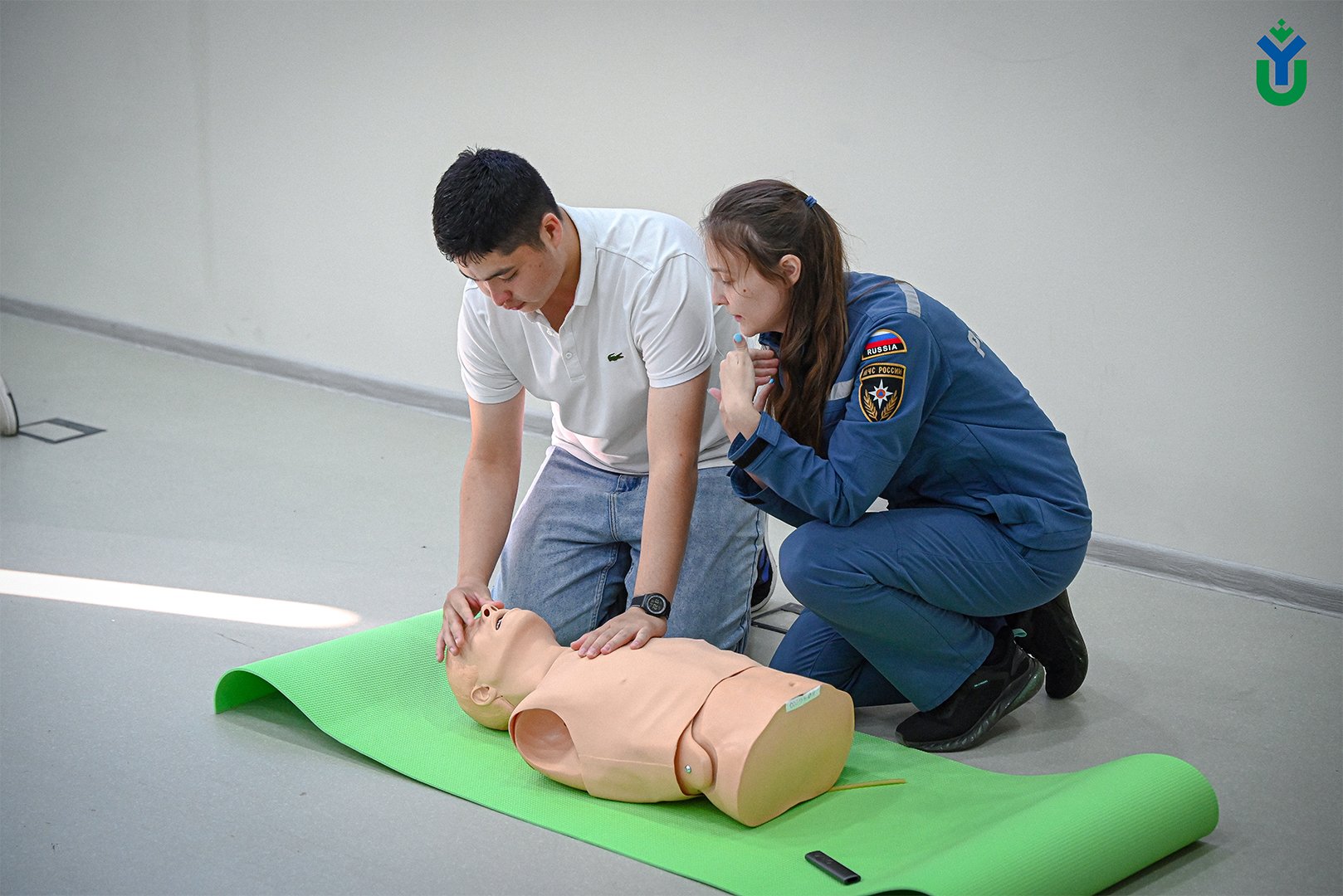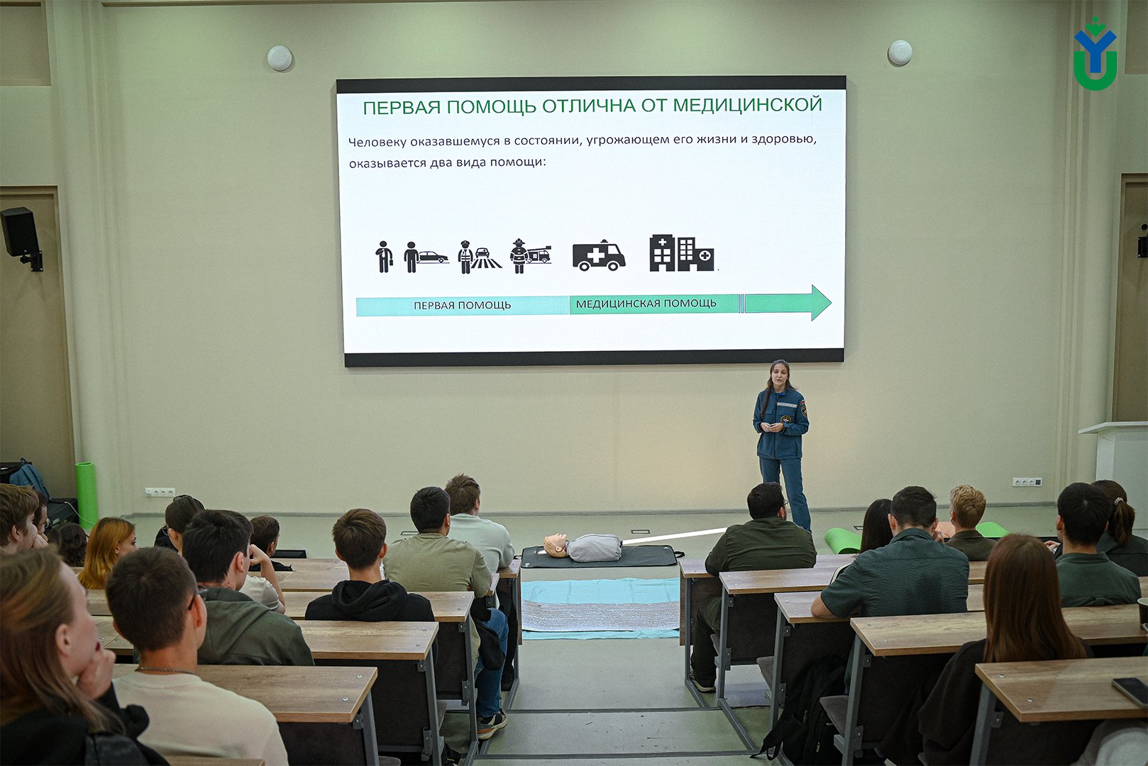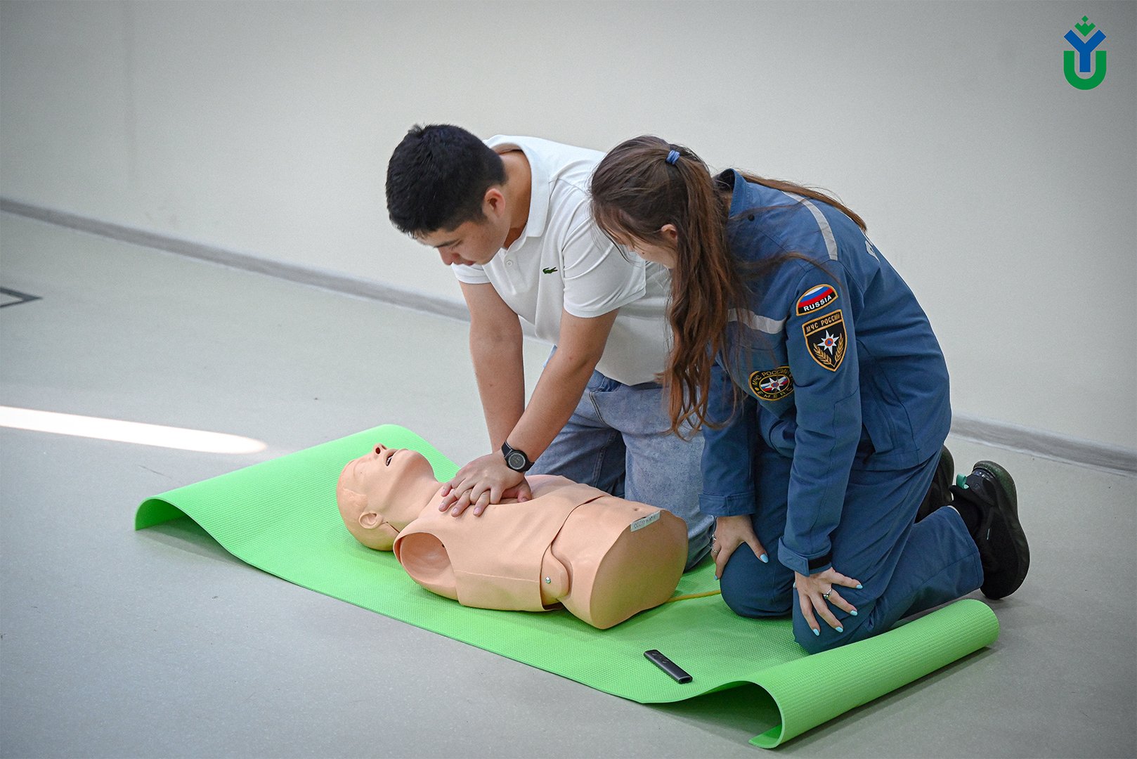 Так, эксперты рассказали учащимся, чем отличается первая помощь от медицинской и что нужно делать до прибытия бригады скорой медицинской помощи. В частности, показали студентам, как правильно проводить сердечно-лёгочную реанимацию, а также как придавать пострадавшему правильное устойчивое боковое положение. Первокурсники применили полученные знания на месте – делали искусственное дыхание и непрямой массаж сердца манекену.