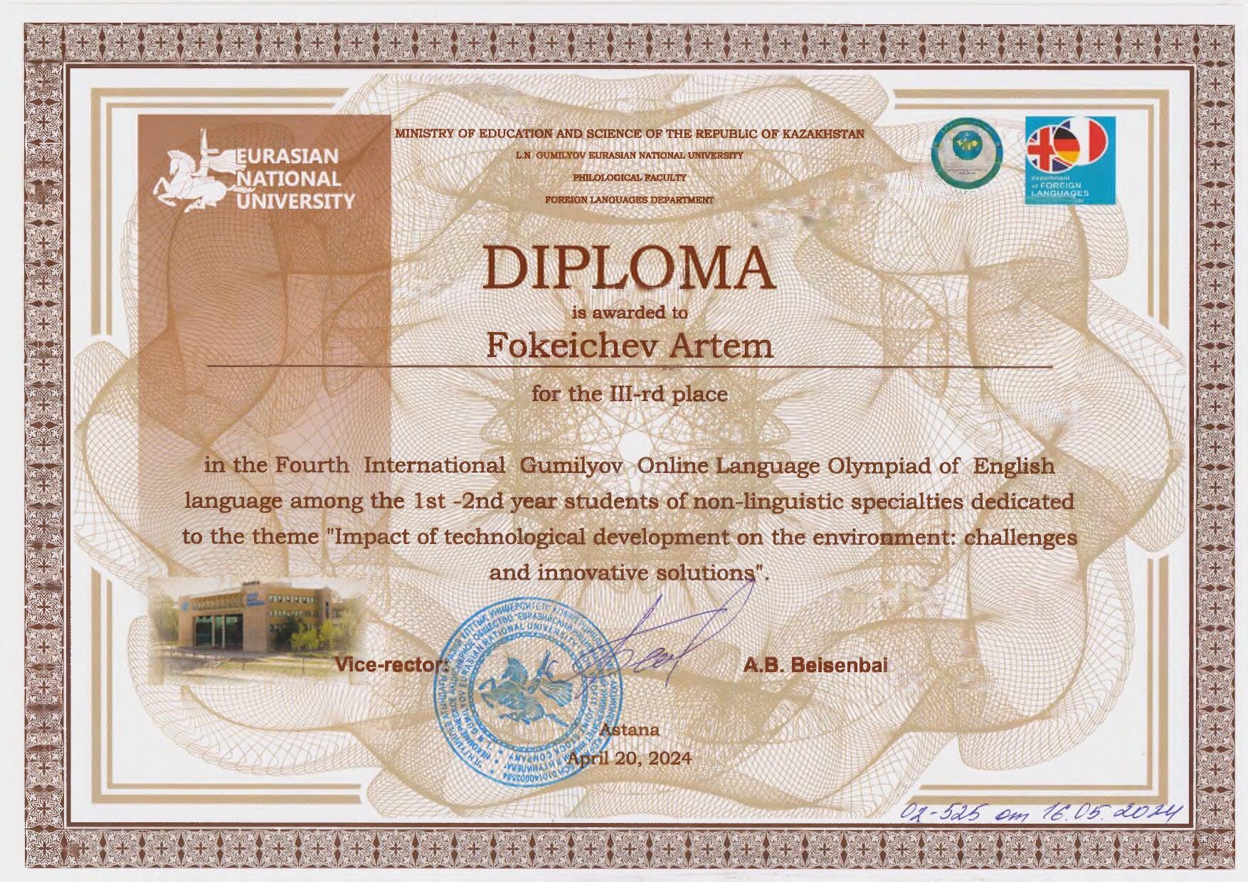 Студент 1 курса Инженерной школы цифровых технологий Артём Фокейчев занял 3-е место на IV Международной Гумилёвской онлайн-олимпиаде. Её провёл Евразийский национальный университет им. Л.Н. Гумилева (Республика Казахстан) среди студентов 1-2 курсов неязыковых специальностей.