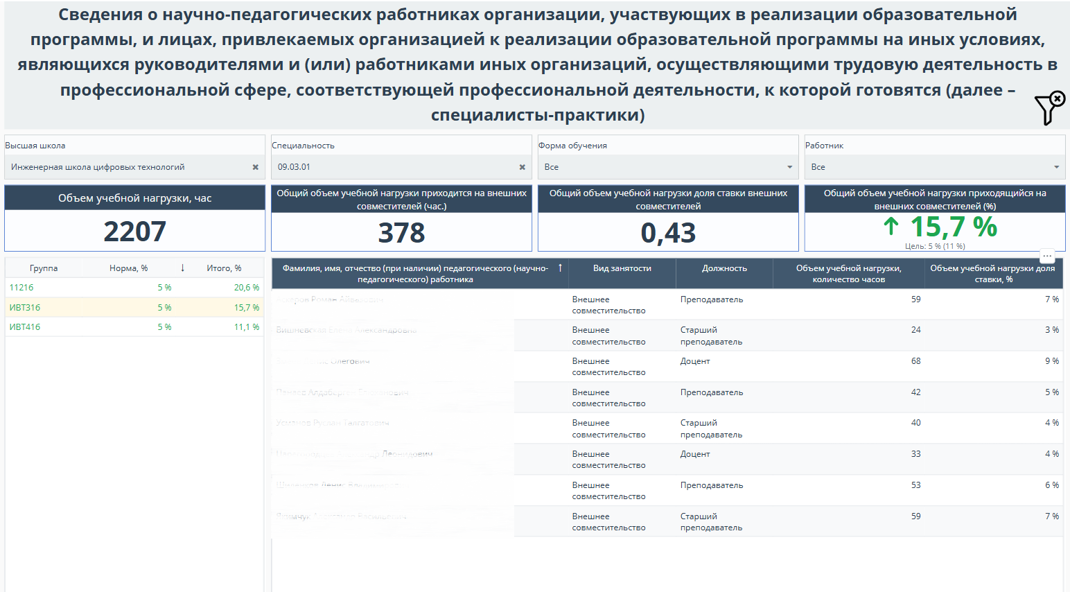 В университете внедрён цифровой сервис «Сведения о кадровом обеспечении образовательных программ». Он обеспечивает непрерывный мониторинг соответствия профессорско-преподавательского состава образовательной программы требованиям Федеральных государственных образовательных стандартов (ФГОС) и способствует эффективному планированию учебной нагрузки. Сервис разработан с помощью BI-системы Visiology и аналитической платформы Loginom. Источники данных: АИС «Галактика», АС «Учебные планы» и 1С.