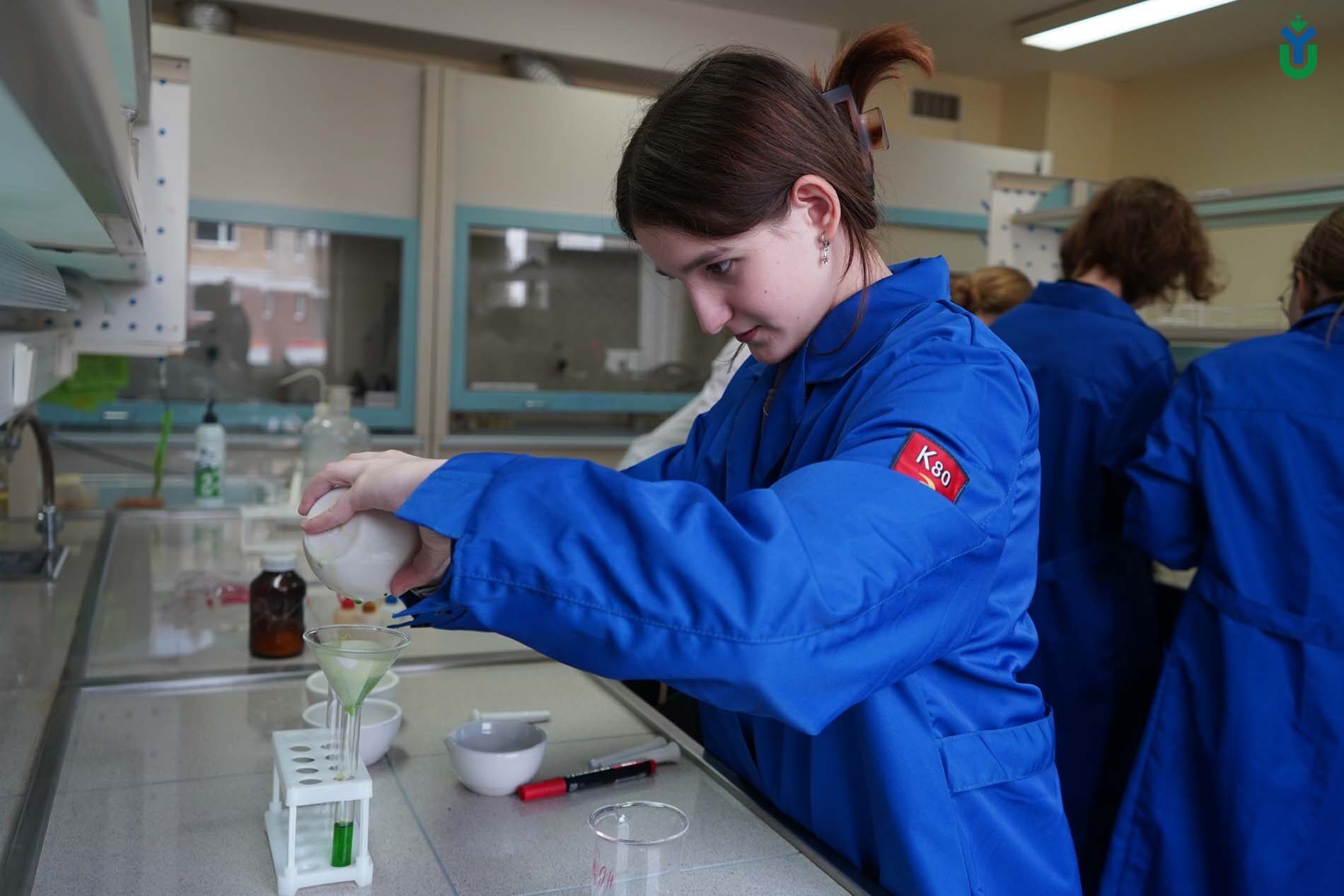 «Ребята выделяли хлорофилл этиловым спиртом, затем делили получившийся раствор на две пробирки. К одной из них добавляли соляную кислоту, чтобы разрушить хлорофилл, цвет раствора стал коричневым. В другую ничего не добавляли, там был только хлорофилл, поэтому раствор остался зелёным. Потом сравнивали содержимое пробирок: смотрели результат под ультрафиолетовой лампой», - рассказала студентка 3 курса Милана Мансурова.