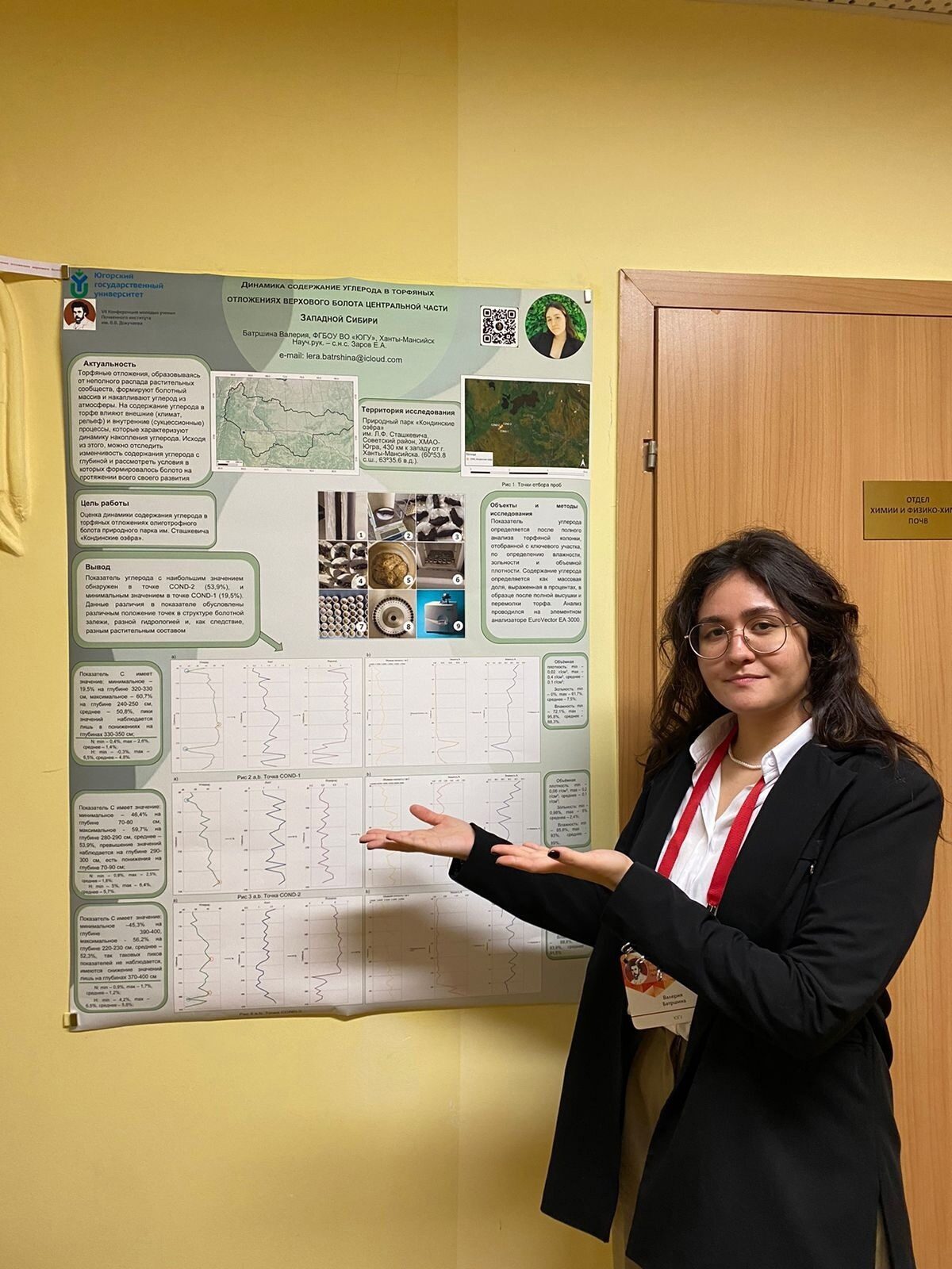 С докладом «Динамика содержания углерода в торфяных отложениях верхового болота центральной части Западной Сибири» выступила Валерия Батршина. В своём исследовании студентка и лаборант Лаборатории экосистемно-атмосферных связей лесоболотных комплексов ЮГУ оценивала динамику углерода в торфяных отложениях олиготрофного болота на территории природного парка им. Сташкевича «Кондинские озёра», в трёх точках отбора проб.